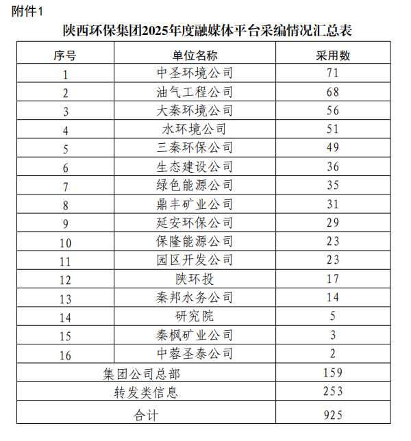 陜西環(huán)保集團(tuán)2025年度融媒體平臺稿件采用及2025年四季度優(yōu)秀稿件評選情況通報