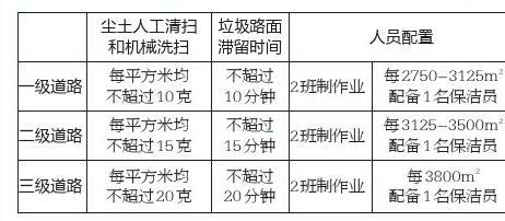 標(biāo)準(zhǔn)提到,西安市道路清掃保潔等級(jí)劃分為一級(jí)、二級(jí)、三級(jí)道路。道路清掃保潔質(zhì)量應(yīng)達(dá)到“道牙無塵,路無雜物,設(shè)施整潔,路見本色”的質(zhì)量標(biāo)準(zhǔn)。鐘鼓樓廣場(chǎng)、東南西北大街、省委周邊道路、大雁塔廣場(chǎng)和周邊道路、新城廣場(chǎng)周邊道路、張家堡廣場(chǎng)和周邊道路等重點(diǎn)區(qū)域地面塵土,人工清掃每平方米不超過5克,垃圾路面滯留時(shí)間不超過5分鐘;保潔員人員配備上,上述重點(diǎn)地區(qū)按三班制作業(yè),每2750平方米配備一名保潔員(一、二、三級(jí)道路作業(yè)標(biāo)準(zhǔn)見表格)。