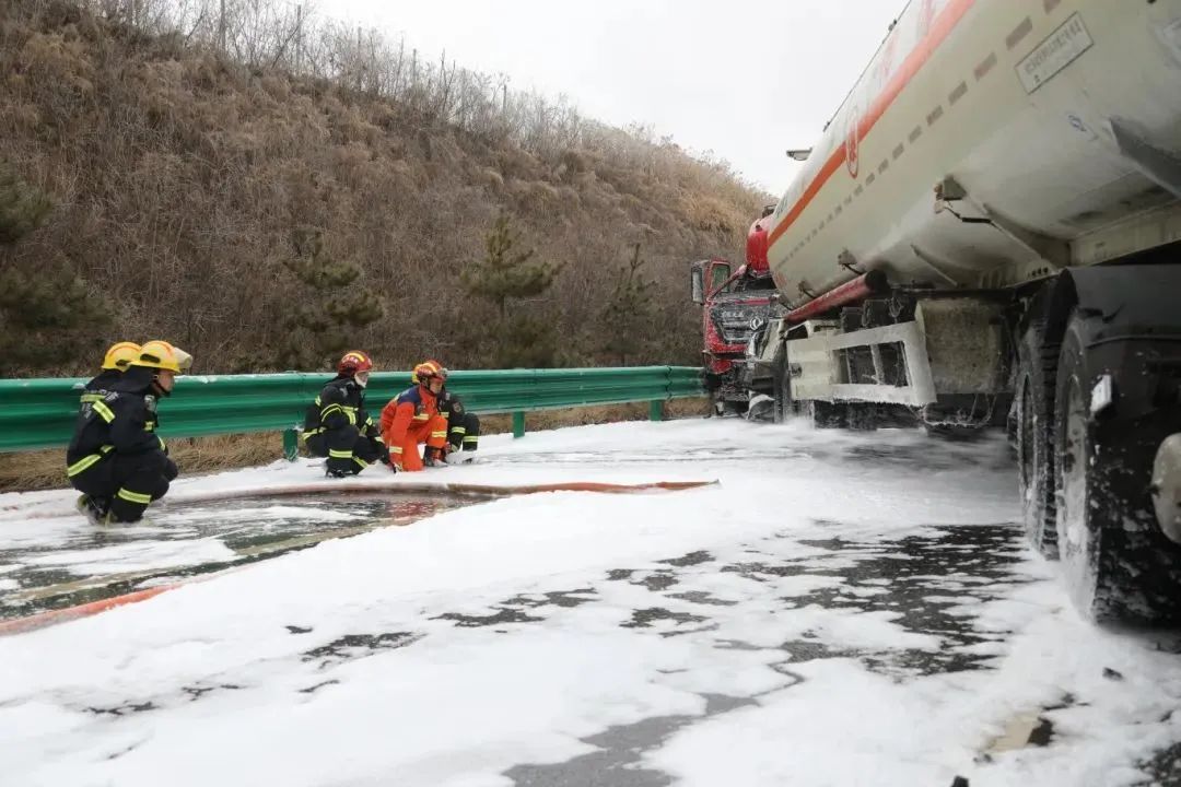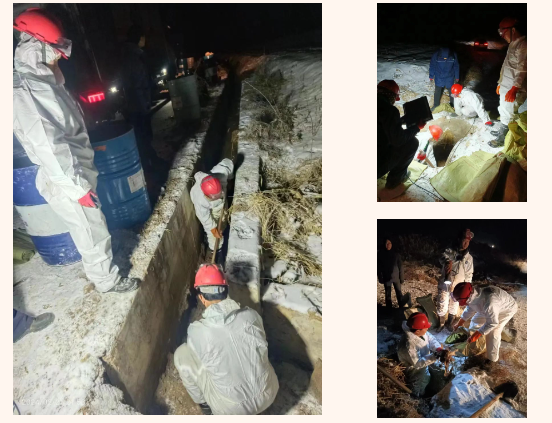 風雪交加,國道溝深路滑,應急救援車行駛了近7個小時后到達現(xiàn)場開展泄露污染物清理工作。由于現(xiàn)場無法使用機械設備,新天地公司應急救援隊人員只能穿好防護服進行人工清理。零下8℃的雪天,隊員們干的大汗淋漓,人群中冒出一股股熱氣。經過近6個小時的緊張作戰(zhàn),直至深夜,現(xiàn)場共清理污染油泥9.38噸,均運回省危廢處置中心安全處置。